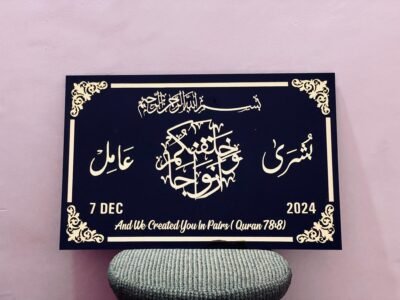 This stunning personalized acrylic frame showcases the Quranic verse “And We Created You in Pairs” (Quran 78:8), making it a perfect wedding, anniversary, or Eid gift. The modern acrylic design with elegant Arabic calligraphy adds a sophisticated and luxurious touch to any space.
